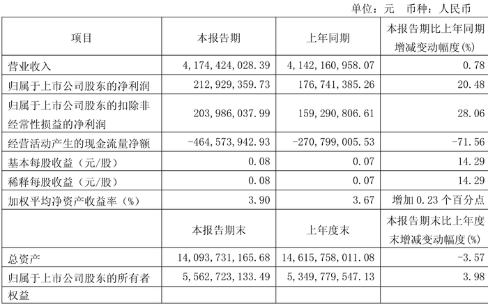 中证智能财讯哈药股份(600664)4月26日披露2025年第一季度报告。公司实现营业总收入41.74亿元,同比增长0.78%;归母净利润2.13亿元,同比增长20.48%;扣非净利润2.04亿元,同比增长28.06%;经营活动产生的现金流量净额为-4.65亿元,上年同期为-2.71亿元;报告期内,哈药股份基本每股收益为0.08元,加权平均净资产收益率为3.90%。