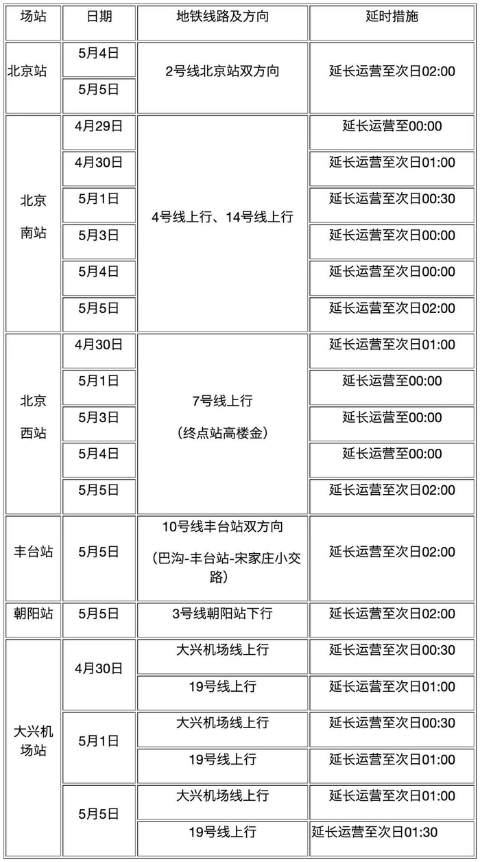 节日期间,北京市充分发挥轨道交通大客流运输优势,坚持“组网延时”“按需延时”的工作原则,针对性制定重点场站夜间延时措施。比如5月5日夜间,地铁2、3、4、7、10、14、19号线和大兴机场线8条线路共同“组网”,最晚延长运营至次日2时。延时期间各线路之间可实现换乘,方便远距离疏运。