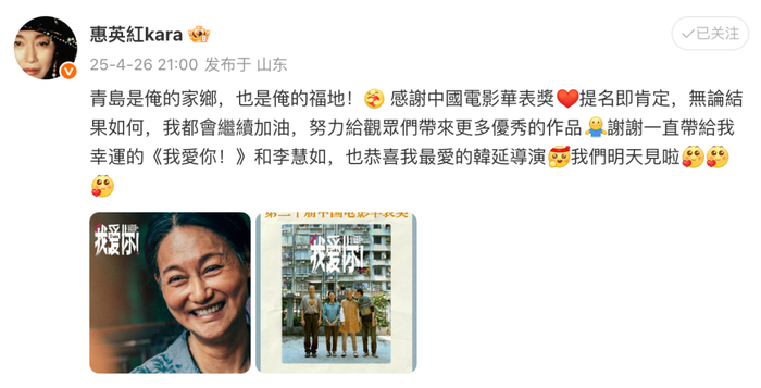 昨晚,惠英红在社交媒体发文,兴奋地说“青岛是俺的家乡,也是俺的福地”!她表示,提名即肯定,无论结果如何都会继续努力。