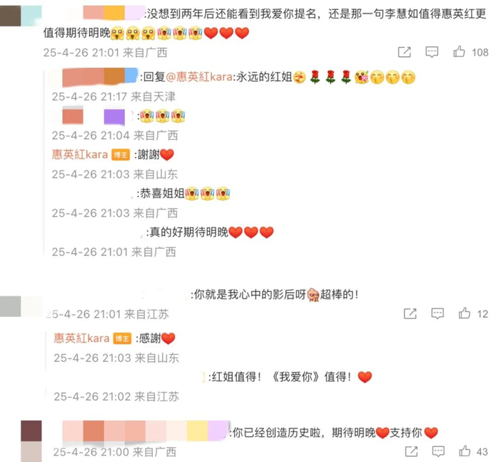 来自全国各地的影迷,纷纷在社交媒体平台向惠英红表示祝贺和支持。惠英红也真诚地回以感谢。