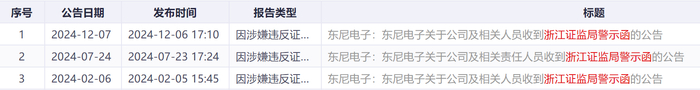 值得注意的是,2024年以来,东尼电子已三次收到浙江证监局下发的警示函,均涉及信息披露违规问题。