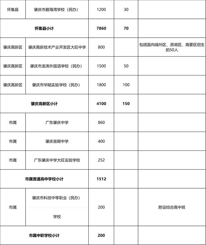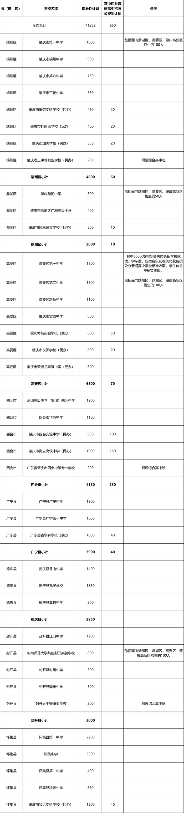 肇庆市第一中学面向鼎湖区、高要区和肇庆高新区招生共100人;肇庆鼎湖中学面向端州区、高要区和肇庆高新区招生共50人;高要区第二中学面向端州区、鼎湖区和肇庆高新区招生共100人;肇庆高新技术产业开发区大旺中学面向端州区、鼎湖区和高要区招生共50人;华南师范大学共建封开实验学校面向端州区、鼎湖区、高要区、肇庆高新区招生共100人。以上安排的招生计划不具体分配到各区。深圳高级中学(集团)四会中学面向四会市招生1200人。