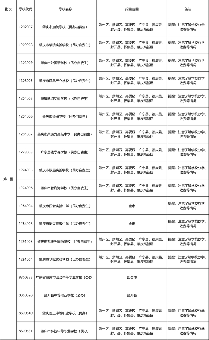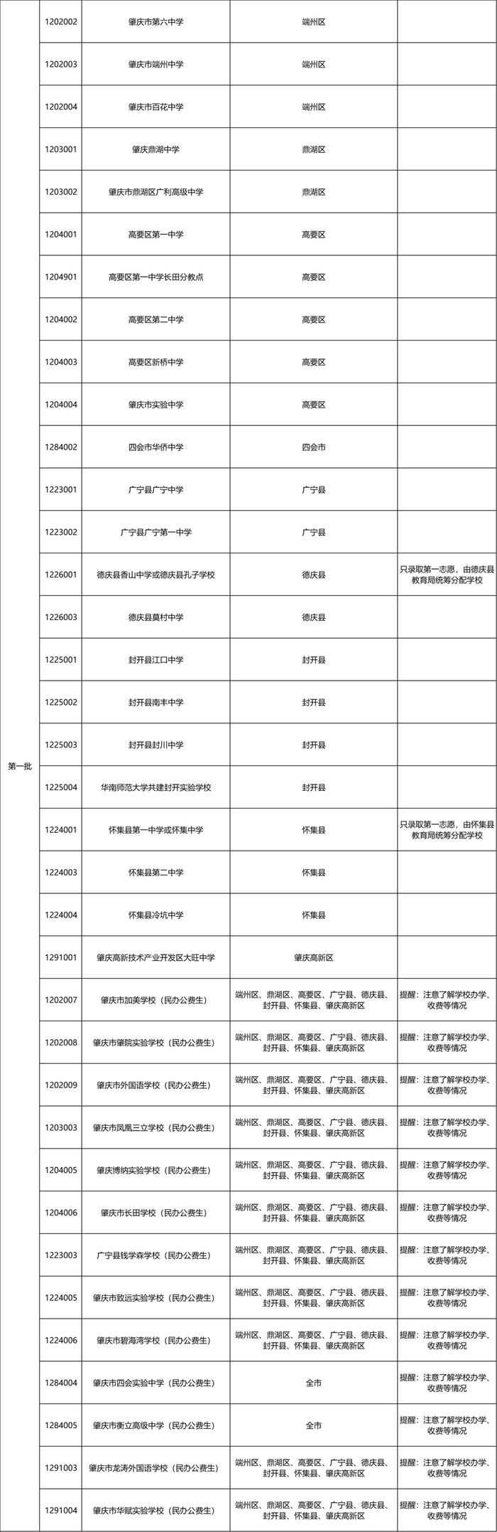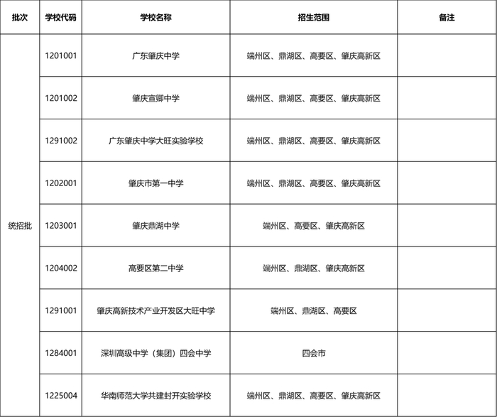 2.市城区跨区域招生试点普通高中:肇庆市第一中学、肇庆鼎湖中学、高要区第二中学、肇庆高新技术产业开发区大旺中学;