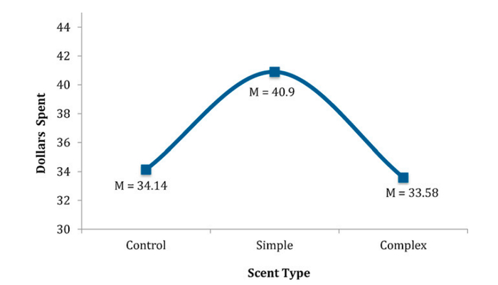华盛顿州立大学学者Eric R. Spangenberg等通过在一家家居装饰店中的对比实验发现,处于简单香味环境中的顾客平均消费金额为40.9美元,而无香味环境中的顾客平均消费金额则为34.14美元。消费者在简单香味环境中的消费额相对提升19.8%。