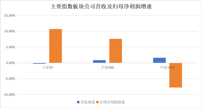 上证50指数成分股公司合计营收规模为176119亿元,合计归母净利润规模为24119亿元,尽管营收增速同比下降0.30%,但净利润增速达10.65%;沪深300指数成分股公司合计营收规模为338980亿元,同比增长0.85%,合计归母净利润规模41129亿元,同比增长7.62%;中证1000指数成分股公司合计营收规模为41043亿元,同比增长1.63%,合计归母净利润规模1847亿元,同比下滑7.75%。