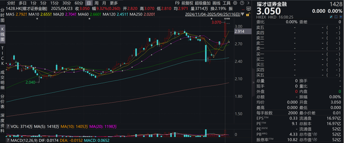 尽管要约收购消息于4月25日公布,但wind显示,4月23日停牌前最后一个交易日,耀才证券已“先涨为敬”“,单日收涨9.32%,已经为今年以来单日最大涨幅。