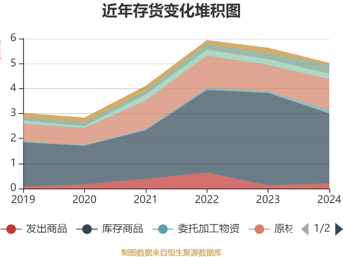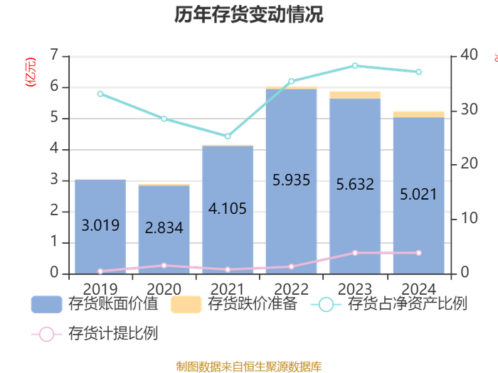 从存货变动来看,截至2024年末,公司存货账面价值为5.02亿元,占净资产的37.06%,较上年末减少6106.39万元。其中,存货跌价准备为1984.3万元,计提比例为3.8%。