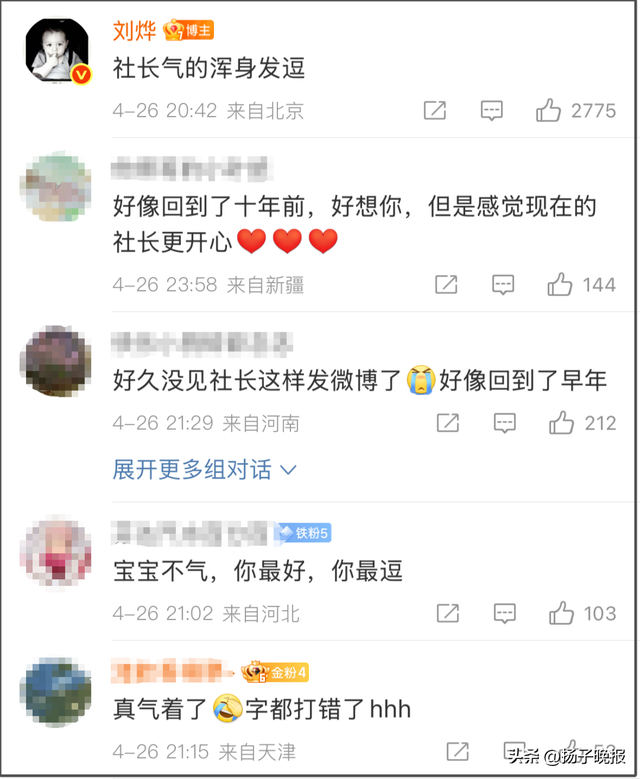 很多粉丝、网友对刘烨的回应表示:“好久没见社长这样发微博了。”