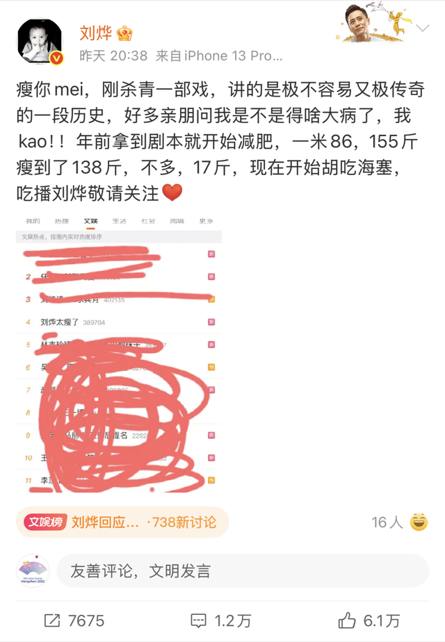 昨晚(26日),刘烨对此事做出回应:“刚杀青一部戏,讲的是极不容易又极传奇的一段历史,好多亲朋问我是不是得啥大病了!年前拿到剧本就开始减肥,一米86,155斤瘦到了138斤,不多,17斤,现在开始胡吃海塞,吃播刘烨敬请关注。”
