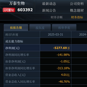 不仅如此,在4月25日披露的2025年一季报里,万泰生物下滑趋势未止,一季度公司营业收入4.01亿元,同比下滑4.76%;归属于上市公司股东净利润-5277.69万元,同比下滑141.98%。这是万泰生物上市以来,首次录得一季度亏损,且公司一季度的经营活动产生的现金流量净额为-8597.29万元。