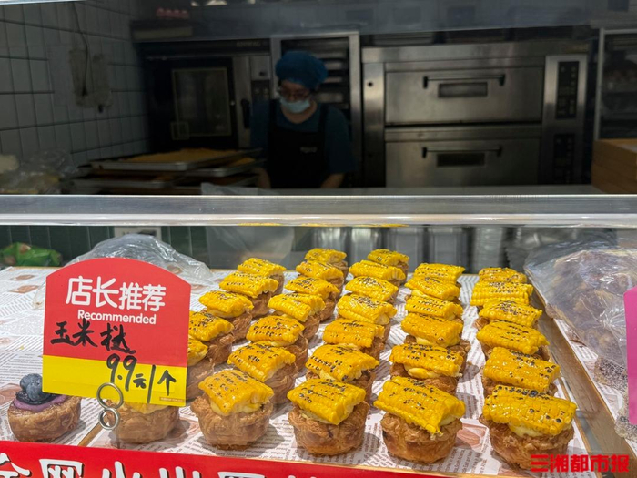 根据团购平台的地址指引,记者来到位于韶山北路的糕熙子国潮糕点。新鲜出炉的玉米蛋挞被整齐码放在展示柜C位,金黄的蛋挞芯上铺着一小段颗粒分明的玉米粒。“玉米蛋挞是我们店最近推出的爆款产品9.9元一个。”该店工作人员十分热情地介绍,“上面放的是水果玉米,底下的蛋挞芯由玉米奶酪制作而成,都是当天现烤现卖的。”