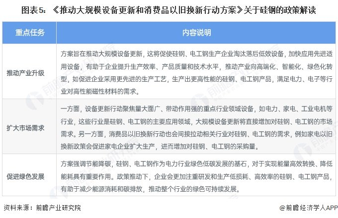 《推动大规模设备更新和消费品以旧换新行动方案》关于硅钢方面提出,重点任务是推动产业升级、扩大市场需求、促进绿色发展。方案旨在推动大规模设备更新,这将促使硅钢、电工钢生产企业淘汰落后低效设备,加快应用先进适用设备;方案强调节能降碳,硅钢、电工钢作为电力行业绿色低碳发展的基石,对于实现能量高效转换、降低能耗具有重要作用。