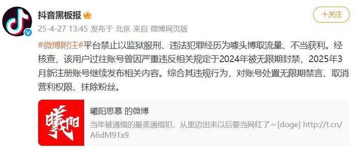 下午@抖音黑板报 发文,“平台禁止以监狱服刑、违法犯罪经历为噱头博取流量、不当获利。经核查,该用户过往账号曾因严重违反相关规定于2024年被无限期封禁,2025年3月新注册账号继续发布相关内容。综合其违规行为,对账号处置无限期禁言、取消营利权限、抹除粉丝。”