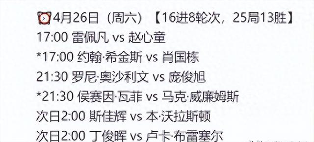 2025 年斯诺克世锦赛正如火如荼地进行,赛事已经步入白热化阶段。在这场全球顶尖斯诺克选手汇聚的盛宴中,中国选手的表现牵动着无数球迷的心。北京时间 4 月 26 日,比赛进入第 8 个比赛日,多场焦点对决吸引了全世界的目光,其中赵心童与雷佩凡的第二阶段比赛,以及肖国栋和希金斯的第三阶段比赛,战况尤为激烈。
