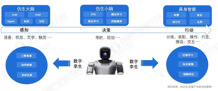 当以ChatGPT为代表的新一代人工智能技术爆发后,具身智能热潮随之而来,具身智能技术涵盖“大脑”、“小脑”关键技术群,实现人形机器人自主感知、决策与行动。