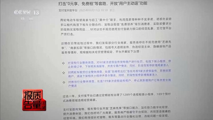 记者注意到,支付宝已经在3月11日发布公告,表示将严打宠物商家滥用“芝麻先享”扣款接口的行为,并对违规商家进行处罚,责令其整改。同时公告中称,支付宝已向商家和服务商开放了“用户主动退”的产品功能,支持消费者一键申请解约,并且部分商家已测试开通。