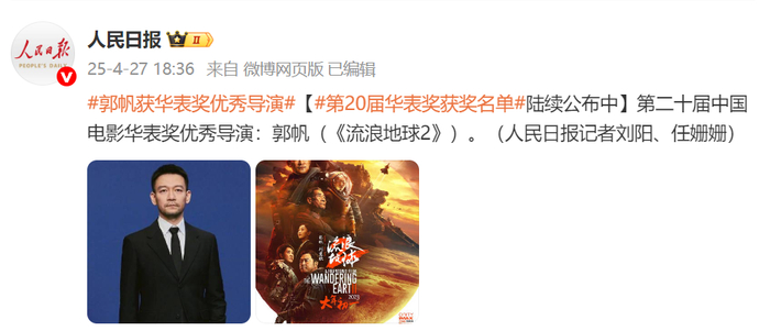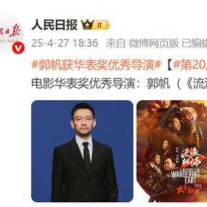 郭帆凭《流浪地球2》获华表奖优秀导演 环球网 环球网官方账号 2025.04.2718:42 关注 转自:人民日报微博第二十届中国电影华表奖优秀导演:郭帆(《流浪地球2》)。(人民日报记者刘阳、任姗姗)