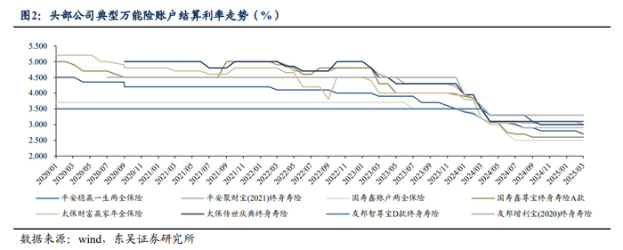事实上,政策引导及利率环境使然,行业结算利率近年来也一直处在下降趋势。东吴证券研报数据显示,2025年3月万能险平均结算利率为2.79%,分别较2023年及2024年末下降60BP(基点)和5BP。