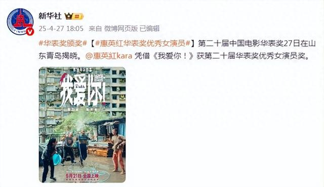 惠英红获第二十届华表奖优秀女演员奖 环球时报 环球时报官方账号 2025.04.2718:59 关注 本文转自【新华社微博】;第二十届中国电影华表奖27日在山东青岛揭晓。惠英红凭借《我爱你!》获第二十届华表奖优秀女演员奖。