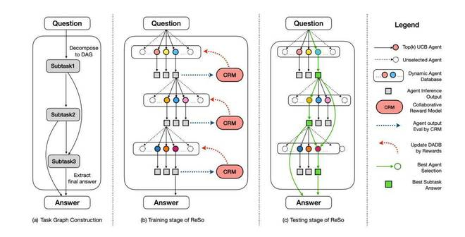 ReSo框架(Reward-driven &Self-organizing)为复杂推理任务中的多智能体系统(MAS)提供了全新解法,在处理复杂任务时,先分解生成任务图,再为每个子任务匹配最佳 agent。将任务图生成与奖励驱动的两阶段智能体选择过程相结合,该方法不仅提升了多智能体协作的效率,还为增强多智能体的推理能力开辟了新路径。