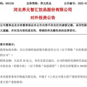 近日,养元饮品入股长江存储的消息在半导体圈引起热议,并成为这个短暂周末里最具话题性的热点之一,而“长江存储再融资94.2亿元”事件也由此浮出水面。事件起因于上周五盘后,养元饮品(在沪主板上市,股票代码为603156)突发一纸公告(见下图)称,养元饮品控股公司芜湖闻名泉泓投资管理合伙企业(有限合伙)以自有资金出资16亿元获得长江存储科技控股有限责任公司0.99%的股份。公告称,该投资早在2023年12月就已经通过审议,由于涉及商业秘密,公司进行了暂缓披露,随着暂缓披露原因消除,才对该投资进行了公告。