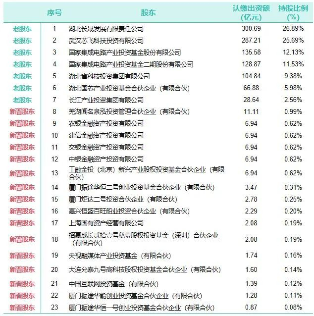 其中,公告对长江存储此次融资前后股权结构进行了披露,融资前7家股东合计认缴出资1052.70亿元,融资后股东数量增加至23家,出资额飙升至1118.12亿元,根据泉泓投资出资16亿元获得11.11亿元认缴出资额来推算,长江存储增加的65.42亿元认缴出资额,意味着获得超过94.21亿元的实际出资额,这是今年以来半导体界披露的最大融资事件。
