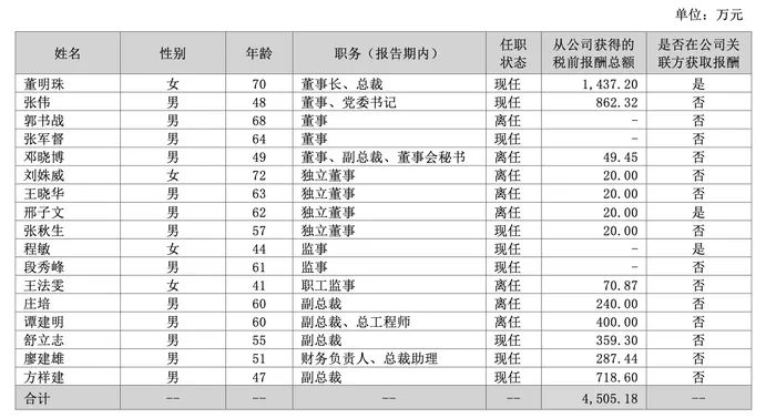 格力电器还披露了高管薪酬水平。2024年,格力电器共有17位董事和高级管理人员。董事长、总裁董明珠年纪最大,为70岁,47岁的副总裁方祥建年龄最小。平均年龄57.2岁。