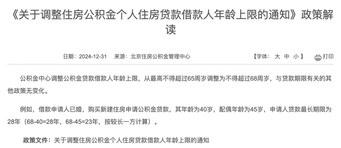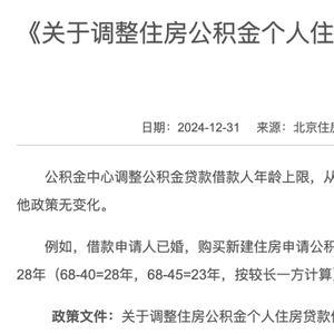 2024年12月31日,北京住房公积金管理中心调整公积金贷款借款人年龄上限,从最高不得超过65周岁调整为不得超过68周岁,与贷款期限有关的其他政策无变化。