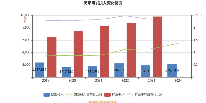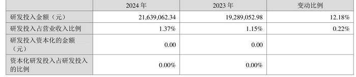 2024年全年,公司研发投入金额为2163.91万元,同比增长12.18%;研发投入占营业收入比例为1.37%,相比上年同期上升0.22个百分点。此外,公司全年研发投入资本化率为0%。