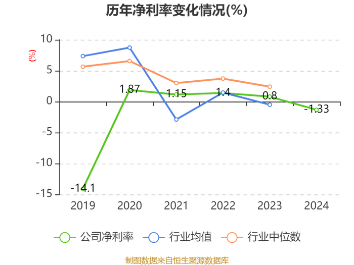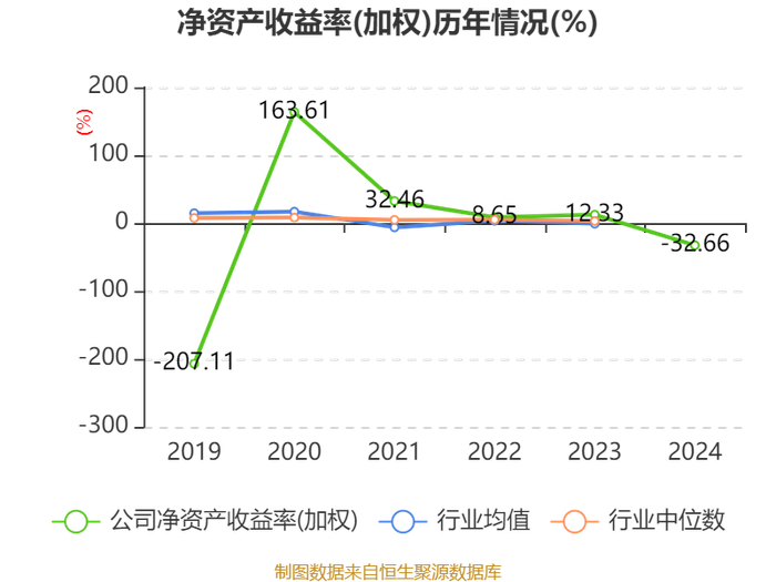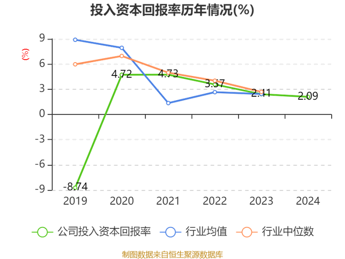 数据显示,2024年公司加权平均净资产收益率为-32.66%,较上年同期下降44.99个百分点。公司2024年投入资本回报率为2.09%,较上年同期下降0.32个百分点。