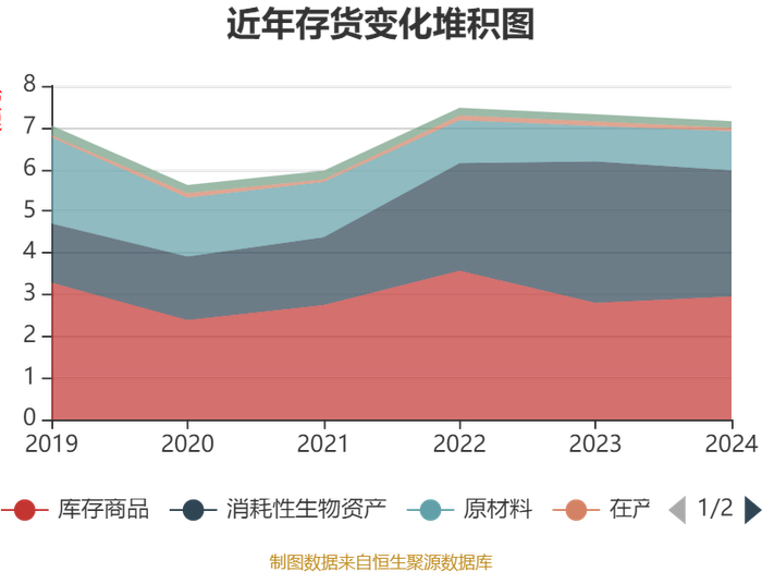 从存货变动来看,截至2024年末,公司存货账面价值为7.15亿元,占净资产的1382.65%,较上年末减少1698.92万元。其中,存货跌价准备为1797.79万元,计提比例为2.45%。