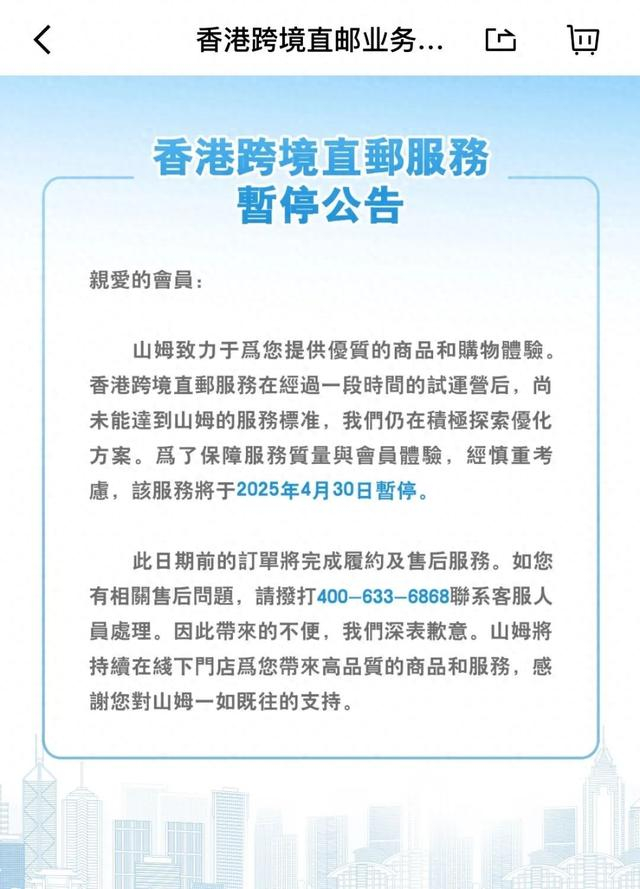公告中明确指出,该服务在经过一段时间的试运营后,因尚未能达到山姆既定的服务标准,结合业务调整需求,最终决定于2025年4月30日停止该项服务。同时,山姆还提醒消费者,在服务终止前如有任何疑问,可随时拨打客服热线寻求帮助。