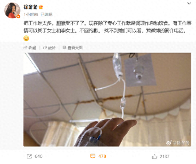 4月27日,女演员徐冬冬在社交平台发布自己生病的图片,并配文:“把工作堆太多,胆囊受不了了,现在除了专心工作就是调理作息和饮食。”