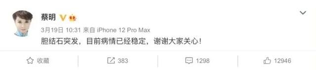 2021年3月,蔡明被曝出有胆结石,网上一组照片显示,蔡明在录制节目时突发不适,被送往医院。事后蔡明发微博回应自己“被紧急送医”:胆结石突发,目前病情已经稳定。