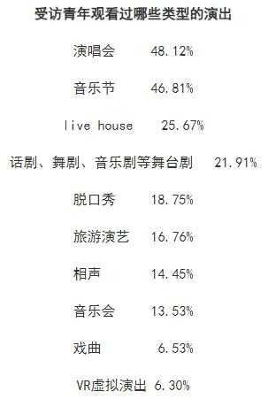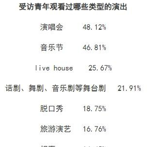 中青校媒调查发现,受访青年观看过各种类型的线下演出,排在前三位的分别是演唱会(48.12%)、音乐节(46.81%)、live house(25.67%),此外还有话剧、舞剧、音乐剧等舞台剧(21.91%)、脱口秀(18.75%)、旅游演艺(16.76%)、相声(14.45%)、音乐会(13.53%)、戏曲(6.53%)、VR虚拟演出(6.30%)等。