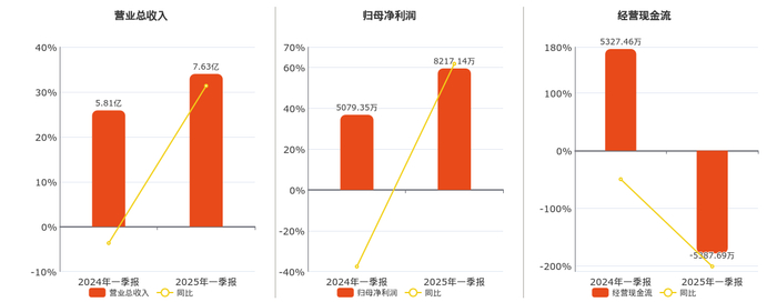 公司营业总收入为7.63亿元,在已披露的同业公司中排名第5。归母净利润为8217.14万元。经营活动现金净流入为-5387.69万元,较去年同报告期经营活动现金净流入减少1.07亿元,同比较去年同期下降201.13%。