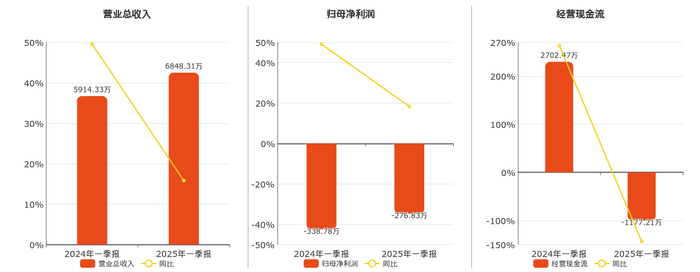 公司营业总收入为6848.31万元。归母净利润为-276.83万元。经营活动现金净流入为-1177.21万元,较去年同报告期经营活动现金净流入减少3879.68万元,同比较去年同期下降143.56%。
