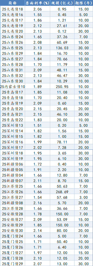 山东、内蒙、大连等省区市上周发行47只地方债,环比减少1只,总规模1,911.23亿元,环比减少94.94亿元(下表)。