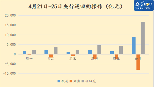 上周央行共投放7天逆回购8,820亿元(下图),当周7天到期逆回购8,80亿元,国库现金定存1,000亿元,MLF到期续作6,000亿元,当周净投放资金7,440亿元;具体来看,央行上周一(4月21日)开展1,760亿元7天逆回购和1,000亿元国库现金定存操作,同时有430亿元逆回购到期,流动性净投放2,330亿元,;周二央行投放2,205亿7天逆回购,到期1,645亿元,实际净回笼560亿元;周三央行开展1,080亿元逆回购,到期1,045亿元,回笼35亿元;周四央行开展2,180亿元7天期逆回购操作,到期2,455亿元,实际回笼资金275亿元,当天央行提前一日发布4月MLF续做规模,本月操作量6,000亿元人民币,超出到期规模达5,000亿元,大幅高于上月;周五央行开展1,595亿元7天逆回购操作,到期2,505亿元,续作6,000亿元MLF,实际资金投放5,090亿元。数据显示,本周(4月27日-30日)央行到期资金为5,045亿元,央行27日开展900亿元7天逆回购操作。