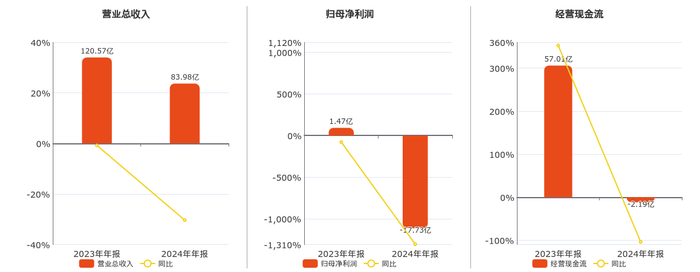 公司营业总收入为83.98亿元,在已披露的同业公司中排名第17,较去年同报告期营业总收入减少36.59亿元,同比较去年同期下降30.35%。归母净利润为-17.73亿元,在已披露的同业公司中排名第56,较去年同报告期归母净利润减少19.20亿元,同比较去年同期下降1305.89%。经营活动现金净流入为-2.19亿元,在已披露的同业公司中排名第48,较去年同报告期经营活动现金净流入减少59.20亿元,同比较去年同期下降103.84%。