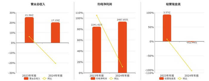 公司营业总收入为17.15亿元,较去年同报告期营业总收入减少4.42亿元,同比较去年同期下降20.48%。归母净利润为2487.85万元,在已披露的同业公司中排名第26。经营活动现金净流入为-912.44万元,在已披露的同业公司中排名第37,较去年同报告期经营活动现金净流入减少3.66亿元,同比较去年同期下降102.56%。
