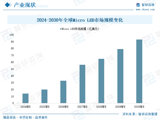Micro LED,即微型发光二极管(Micro Light Emitting Diode),是一种采用1至60微米的LED发光组件构建显示阵列,实现图像显示的新型显示技术。在超高清显示时代对画质和分辨率等规格提出更高要求的背景下,Micro LED被寄予厚望,成为市面上广受关注的新型显示技术之一,其产业规模将持续扩容。根据市场预测,2024年全球Micro LED市场规模将达14亿美元,未来将持续增长,2030年或将达93亿美元。