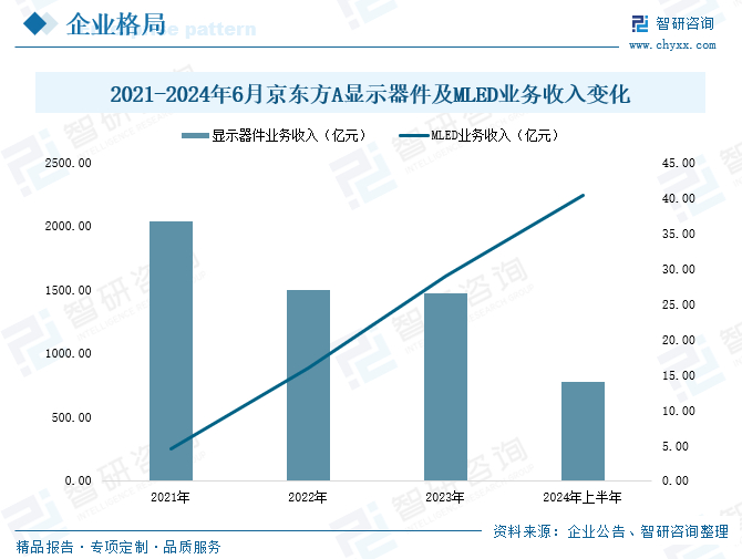 其中,在显示器件业务领域,京东方A致力于提供应用 AMOLED、TFT-LCD、Microdisplay 等技术的端口器件,为客户提供高品质的手机、平板电脑、笔记本电脑、显示器、电视、车载、VR/AR 等显示器件产品。在MLED业务领域,京东方A聚焦器件与解决方案,为电视、显示器、笔记本电脑、车载、VR/AR等领域显示产品提供高品质及高可靠性的 LED 背光产品,同时可为户外显示、商用显示、透明显示、特殊显示等细分应用领域提供高亮度、高可靠性、高对比度的 Mini/Micro LED 显示产品。数据显示,2024年上半年,京东方A显示器件业务收入为780.13亿元,同比增长14.87%;MLED业务收入为40.33亿元,同比增长115.95%。