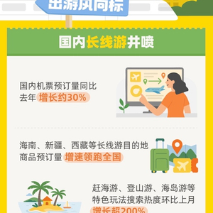 “五一”假期,国内深度游需求快速释放。飞猪数据显示,截至目前,国内机票预订量在去年“五一”强劲增长的基础上,同比上扬了约30%。海南、新疆、西藏、云南、贵州等长线游目的地商品预订量增速领先全国。赶海游、登山游、海岛游等特色玩法的搜索热度环比上月增长超200%。