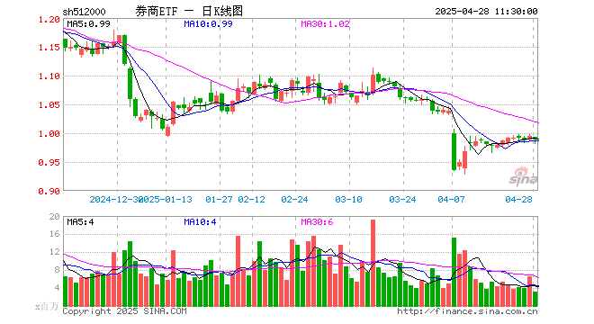 4月28日,截止午间收盘,券商ETF(512000)跌0.50%,报0.989元,成交额3.15亿元。券商ETF(512000)重仓股方面,中信证券截止午盘跌0.04%,东方财富跌0.63%,国泰海通跌0.12%,华泰证券跌0.69%,招商证券涨0.00%,东方证券跌0.44%,广发证券涨0.06%,申万宏源跌0.21%,兴业证券跌0.51%,中金公司跌1.08%。