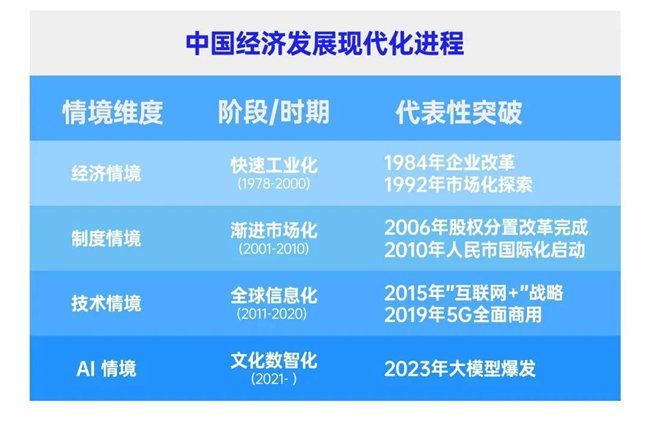 另外,中国的经济发展有自己的特殊国情,如果我们把中国的经济发展放长到47年的时间中(1978年改革开放开始),我们经历了“经济情境-快速工业化进程”、“制度情境-渐进市场化进程”、“技术情境-全球信息化进程”,为突出特征的现代化进程,而近年来的AI的发展尤其是Deepseek的广泛应用,今天被称为第四次工业革命,现在已然是“AI情景-文化数智化进程”时代。