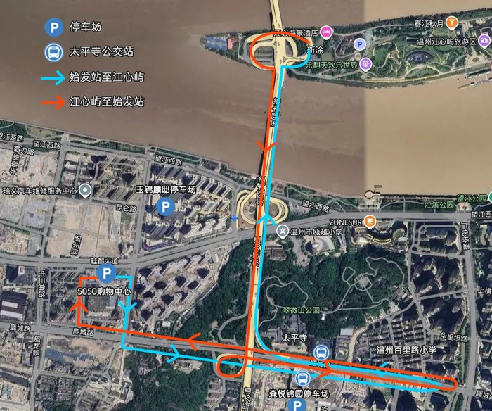 五一假日期间,同步开通温州5050购物中心至江心屿免费接驳车,接驳时间为每日9:00-17:30(正常通行约15分钟一班),接驳线路为江心屿西园停车场?温州5050购物中心停车场。