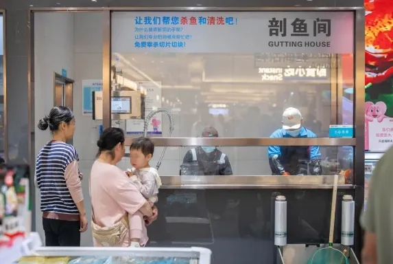 首先是让顾客买得放心的售前服务:水产区提供漏水篮,称重前还会再次沥水,只卖海鲜不卖水;含汤汁的卤味、凉菜等,先称重再盛汤,只卖干重;各区域服务项目也被显著标明,让消费者一目了然。