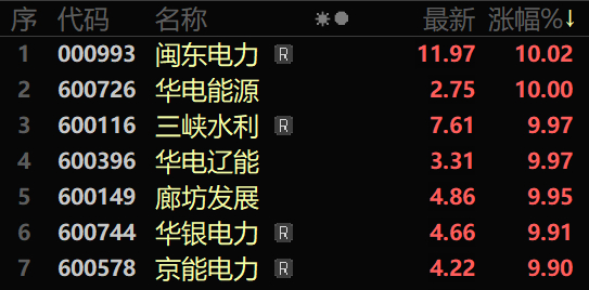 电力股早间集体走强,板块指数盘中一度放量直线拉升涨逾1%,创年内新高。华银电力一字涨停,连续第3日封板,股价创2年半新高(复权),华电能源、三峡水利、华电辽能、京能电力等纷纷涨停。