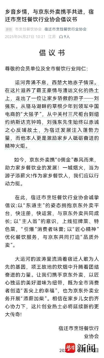 刘强东老家宿迁餐馆挂条幅支持京东外卖,宿迁餐饮协会发布倡议书